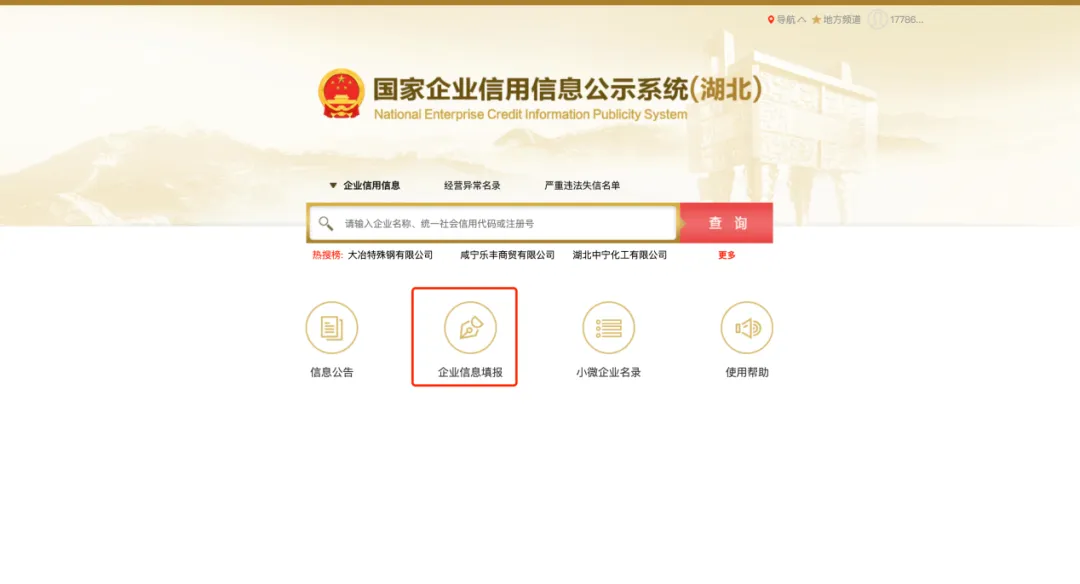 1、进入“国家企业信用信息公示系统(湖北)”(https://hb.gsxt.gov.cn),点击“企业信息填报”,进入企业年报。