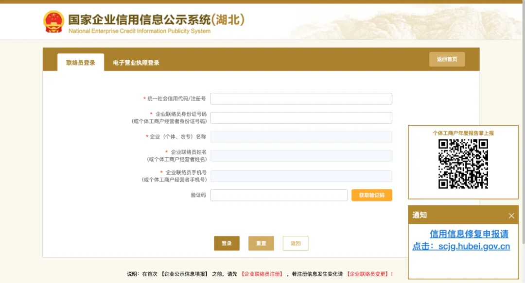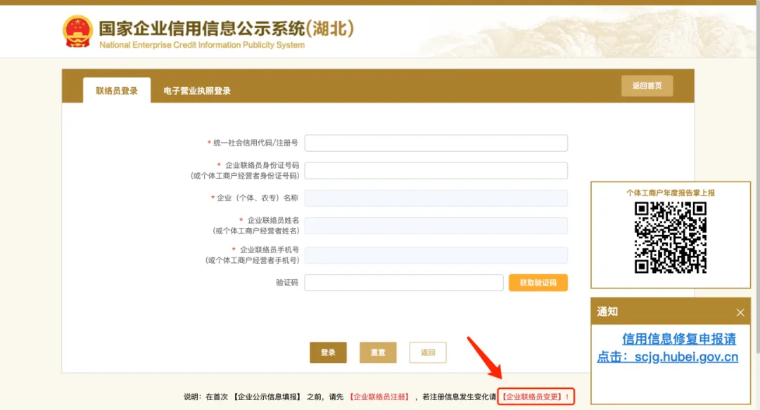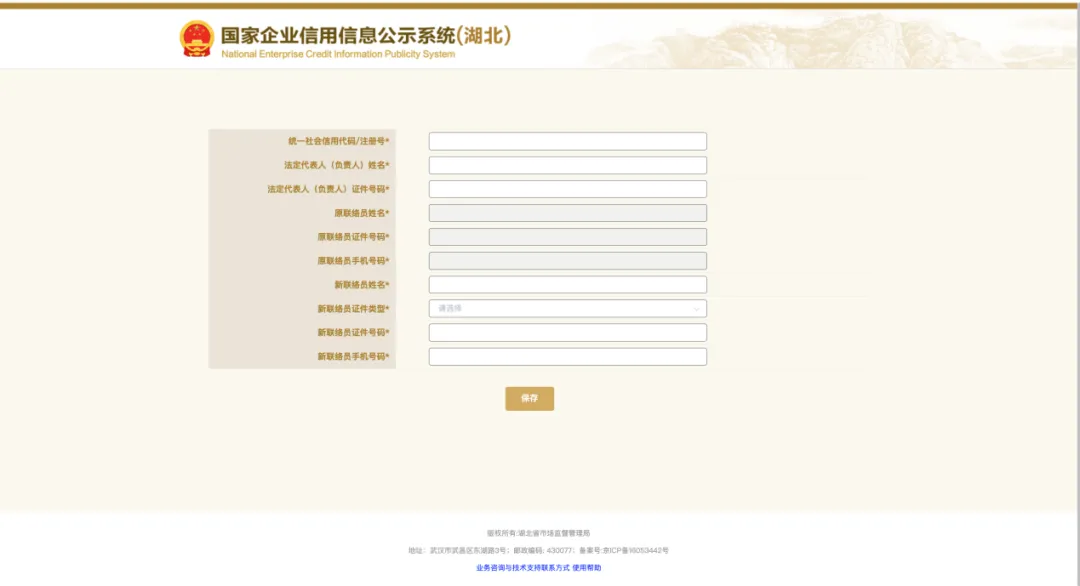 提醒:首次填报年度报告的企业应先进行“企业联络员注册”,若联络员信息发生变化的在“企业联络员变更”中填写后保存。