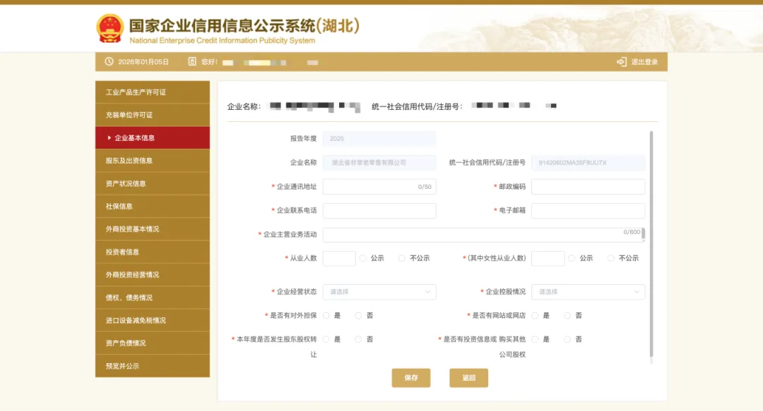 4、填写基本信息,包括通信地址、邮政编码、联系电话、电子邮箱、存续状态、网址、网站信息均为报送时的信息,其余信息为所报告年度12月31日的信息。