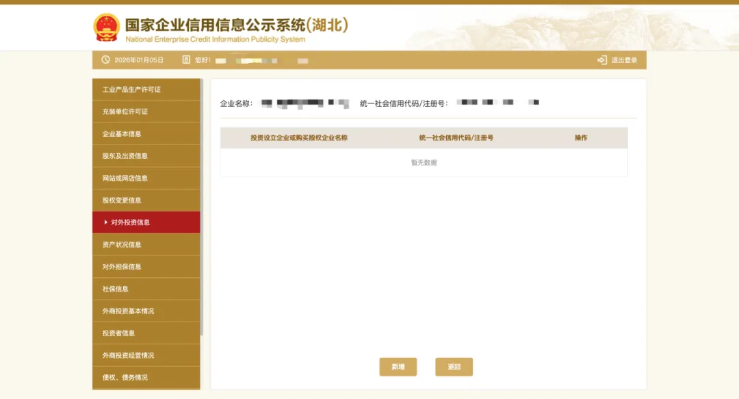 7、填写对外投资信息,点击左边的“对外投资信息”,之后再根据实际情况点击“添加”填写相关信息,填写完成后点击“保存”。如无对外投资情况的,则无需填写此项信息。