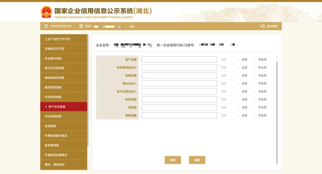 根据审计报告、资产负债等如实填写企业资产状况,若选择“公示”则对外公示,若选择“不公示”,则公示查看该指标不对外公示,显示“不公示”。