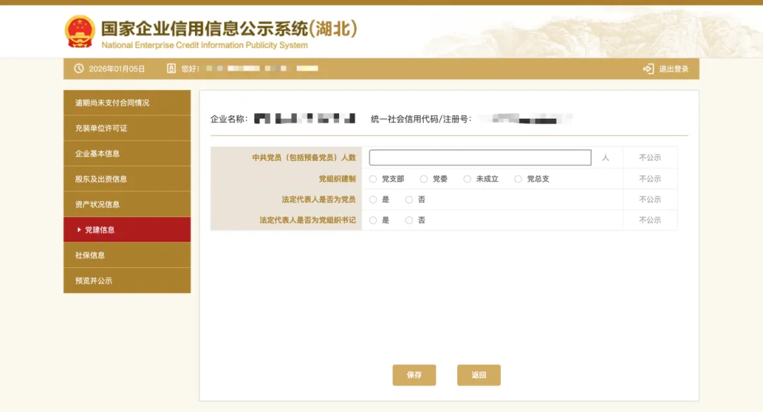 其中,中共党员(包括预备党员)人数,为截至年度报告年份12月31日的人数。如企业暂无党员,填写“0”人后点击保存即可。