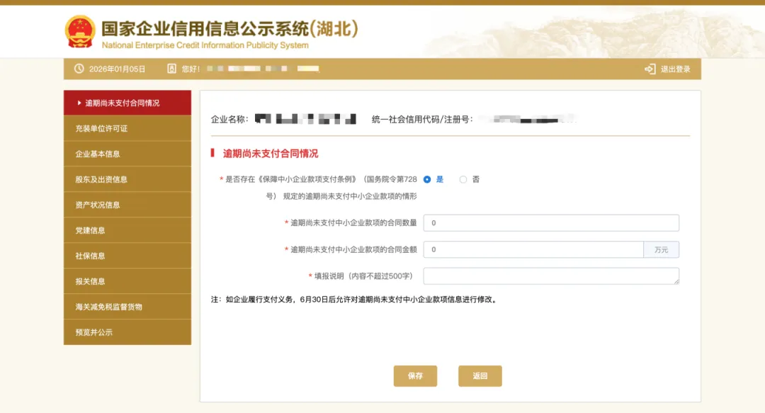 注意:大型企业年报还需报送逾期尚未支付中小企业款项相关信息,由企业自行填报并公示,填报时间为1月1日至6月30日;如企业履行支付义务,6月30日后允许对逾期尚未支付中小企业款项信息进行修改。