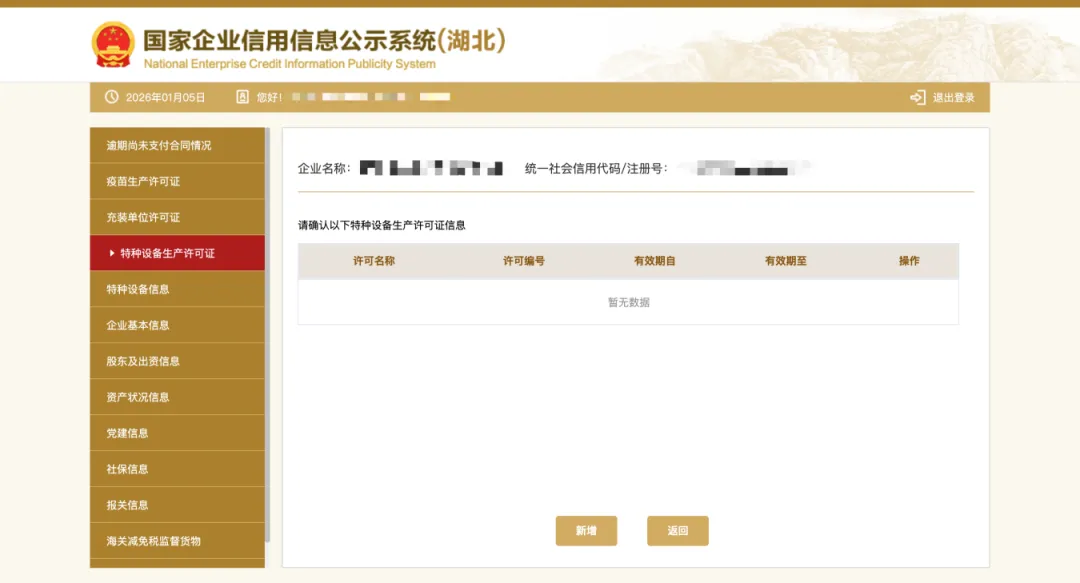 15、特种设备生产许可证,若存在特种设备生产许可信息,需填写特种设备生产许可证,包括许可名称、许可编号、有效期。