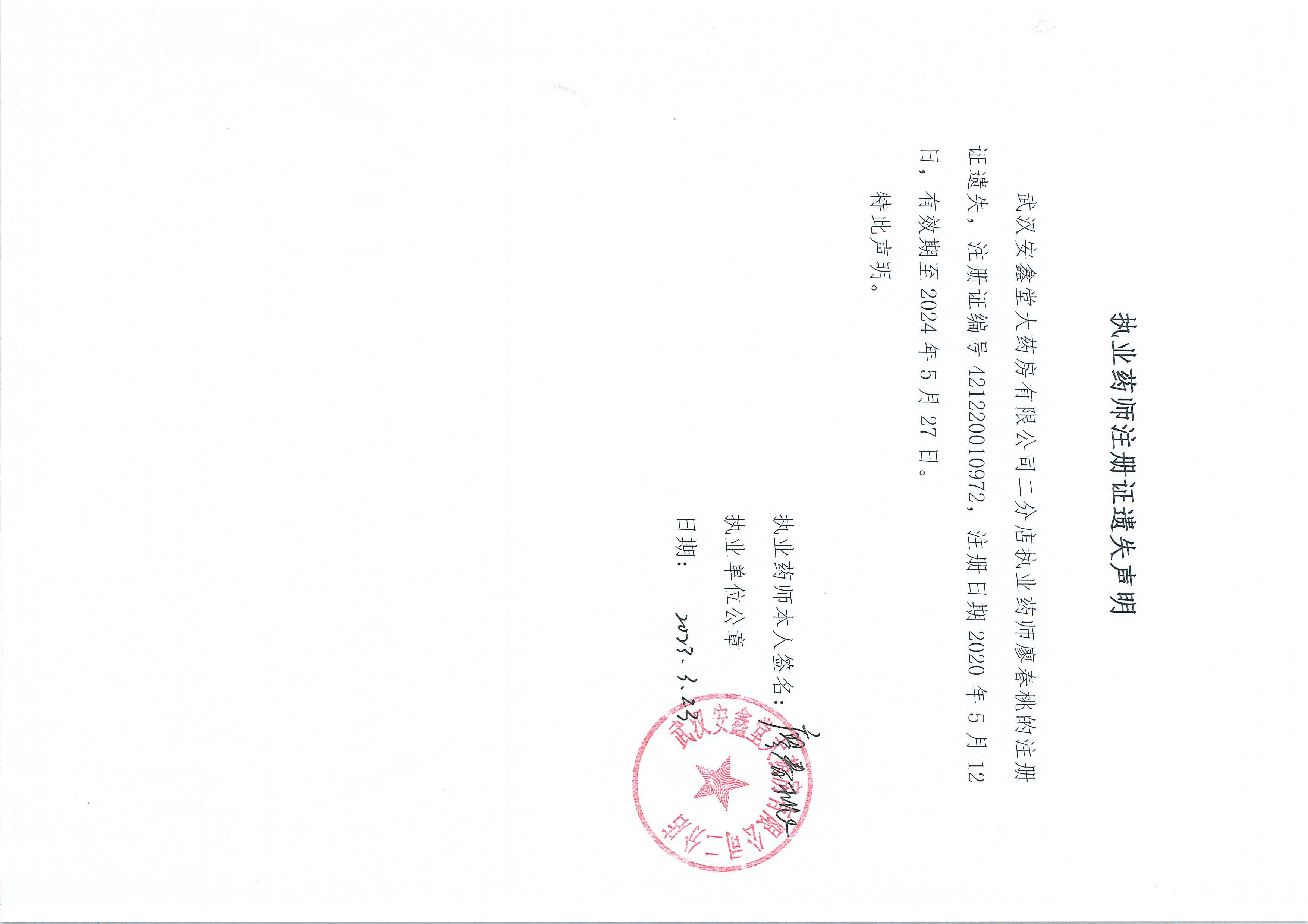 执业药师注册证遗失声明(廖春桃)
