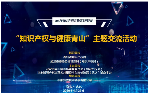 青山区在知识产权宣传周期间采用“线上为主、线下为辅”的方式开展多项知识产权宣传活动。2020年4月23日上午9:30武汉市青山区市场监管局(区知识产权局)以“知识产权与健康青山”为主题开展网络直播培训活动,该活动由湖北省知识产权局、武汉市市场监督管理局(市知识产权局)指导,武汉市青山区市场监督管理局(区知识产权局)以及国家知识产权运营公共服务平台高校运营(武汉)试点平台主办,中部知光技术转移有限公司承办。包括华创源、创青谷科技孵化器在内的辖区企业代表,青山区市场监管局(知识产权局)、区人民检察院、区文化局等知识产权相关部门工作人员近200人参与了线上培训学习。