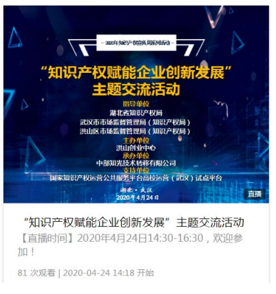 本次活动由湖北省知识产权局、武汉市市场监督管理局(知识产权局)、洪山区市场监督管理局(知识产权局)指导,由洪山创业中心主办,由中部知光技术转移有限公司承办,国家知识产权运营公共服务平台高校运营(武汉)平台支持协办。