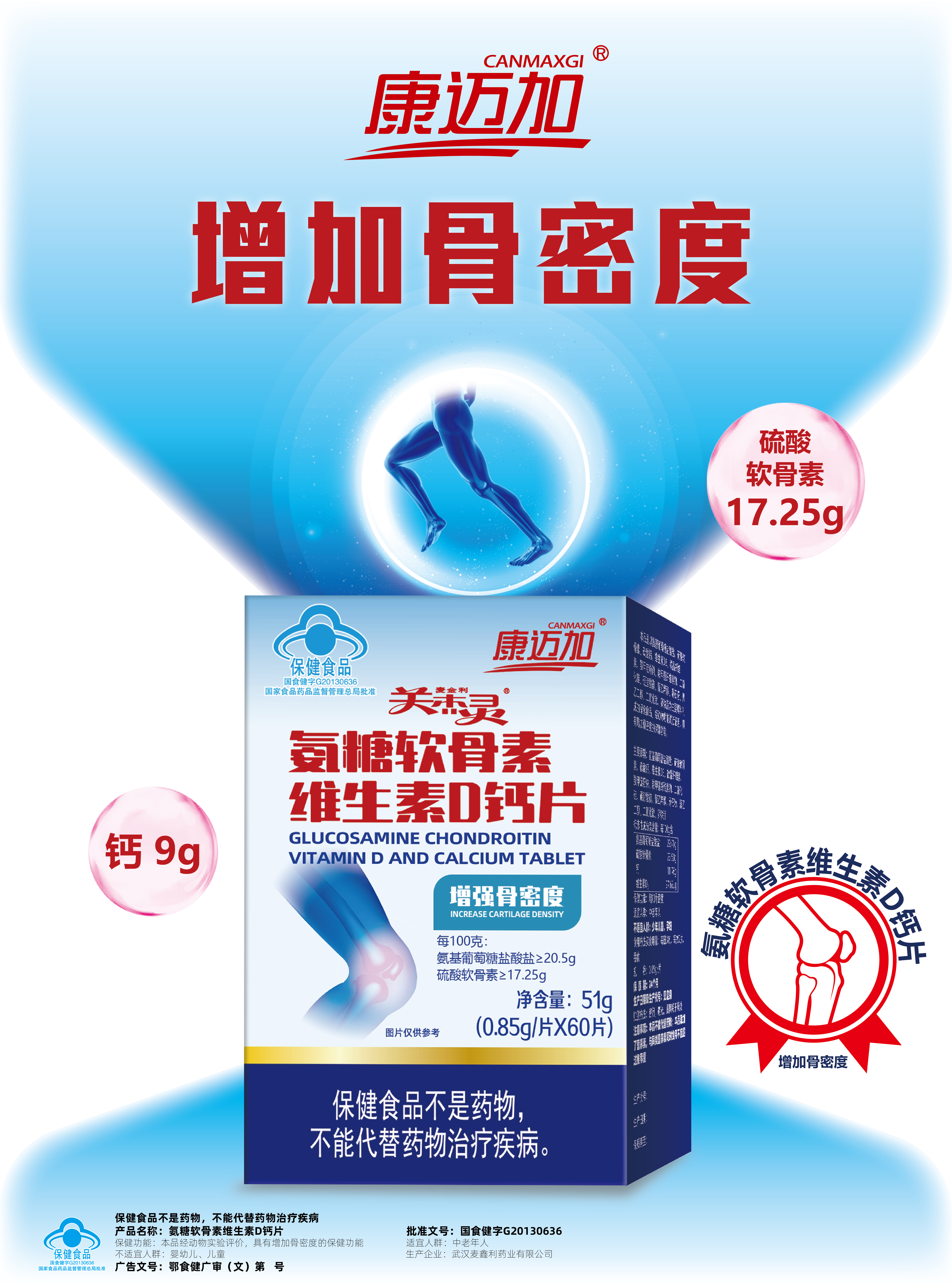 | 鄂食健广审(文)第230114-00525号 | 武汉麦鑫利药业有限公司 | 氨糖软骨素维生素D钙片 | 文 | 2023年1月14日 | 国食健字G20130636 | |