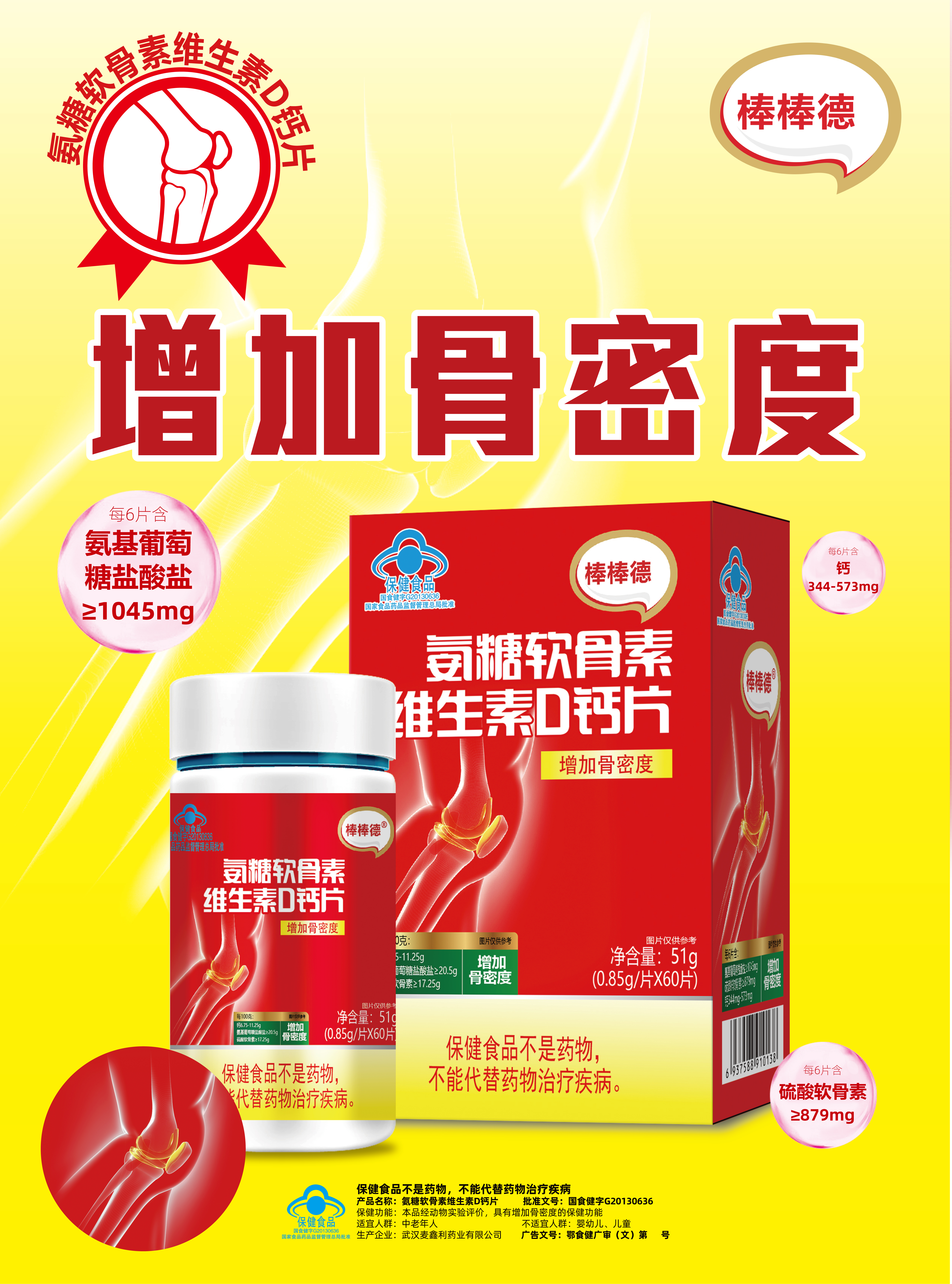 | 鄂食健广审(文)第230114-00536号 | 武汉麦鑫利药业有限公司 | 氨糖软骨素维生素D钙片 | 文 | 2023年1月14日 | 国食健字G20130636 | |