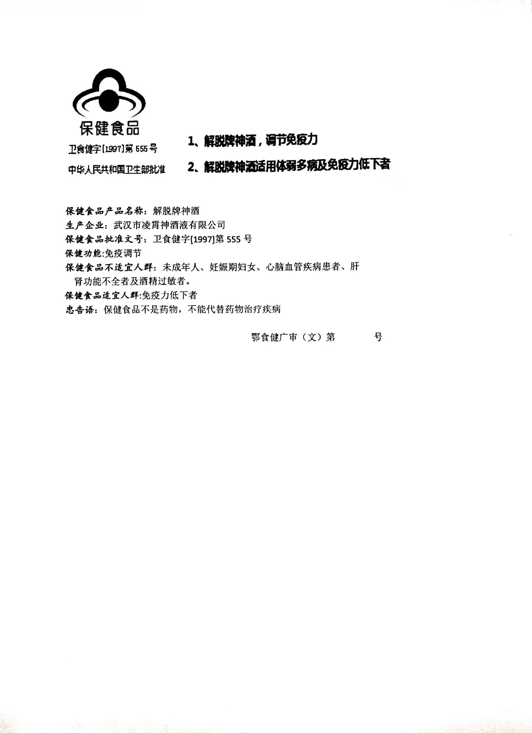 | 鄂食健广审(文)第221228-00472号 | 武汉市凌霄神酒液有限公司 | 解脱牌神酒 | 文 | 2022年12月28日 | 卫食健字[1997]第555号 | |