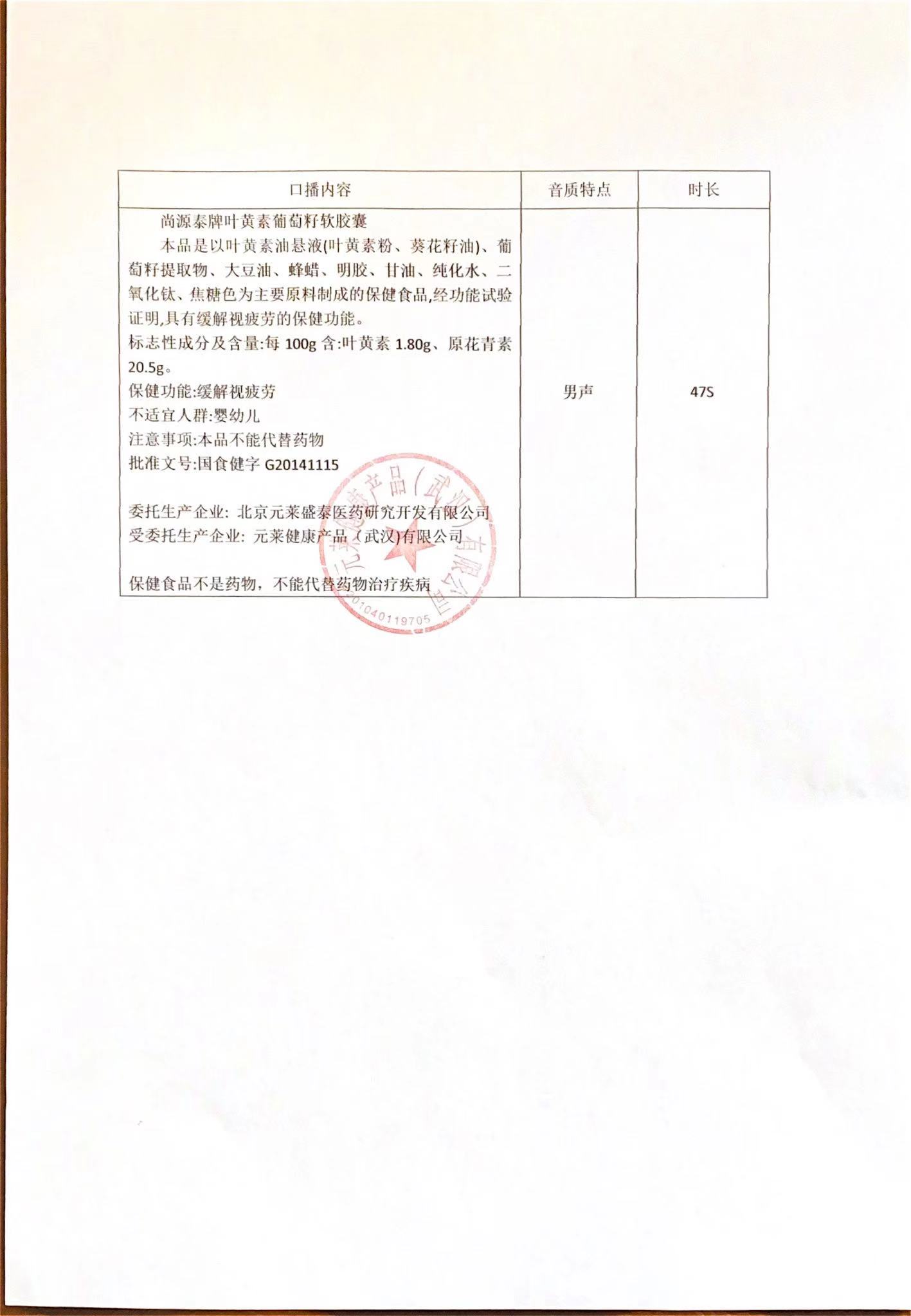| 鄂食健广审(声)第221228-00018号 | 元莱健康产品(武汉)有限公司 | 尚源泰牌叶黄素葡萄籽软胶囊 | 声 | 2022年12月28日 | 国食健字G20141115 | |