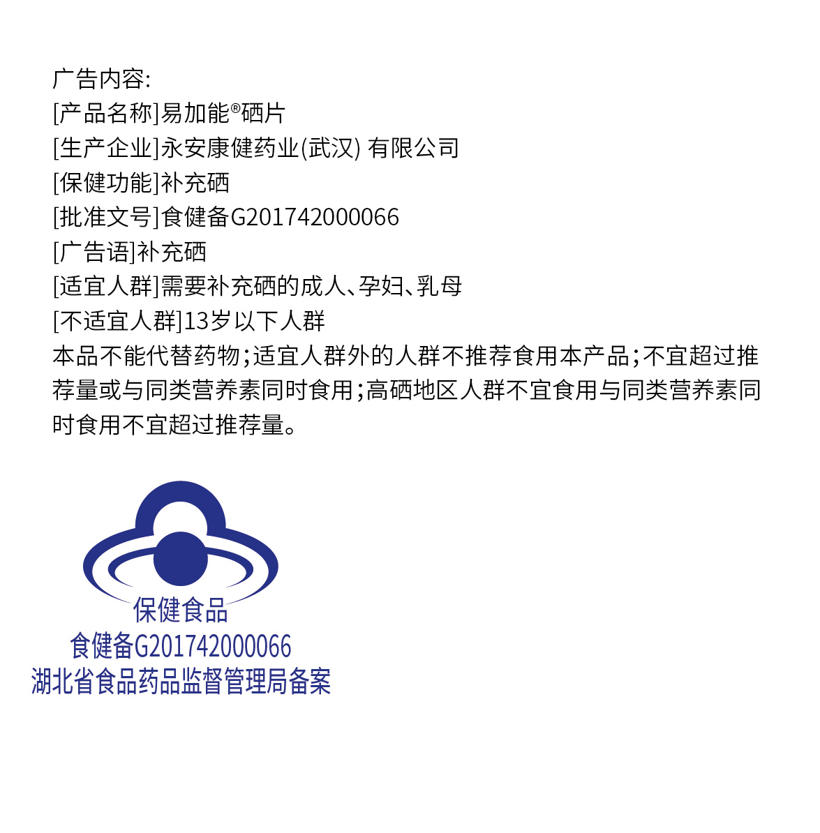 | 鄂食健广审(文)第221221-00464号 | 永安康健药业(武汉)有限公司 | 易加能硒片 | 文 | 2022年12月21日 | 食健备G201742000066 | |