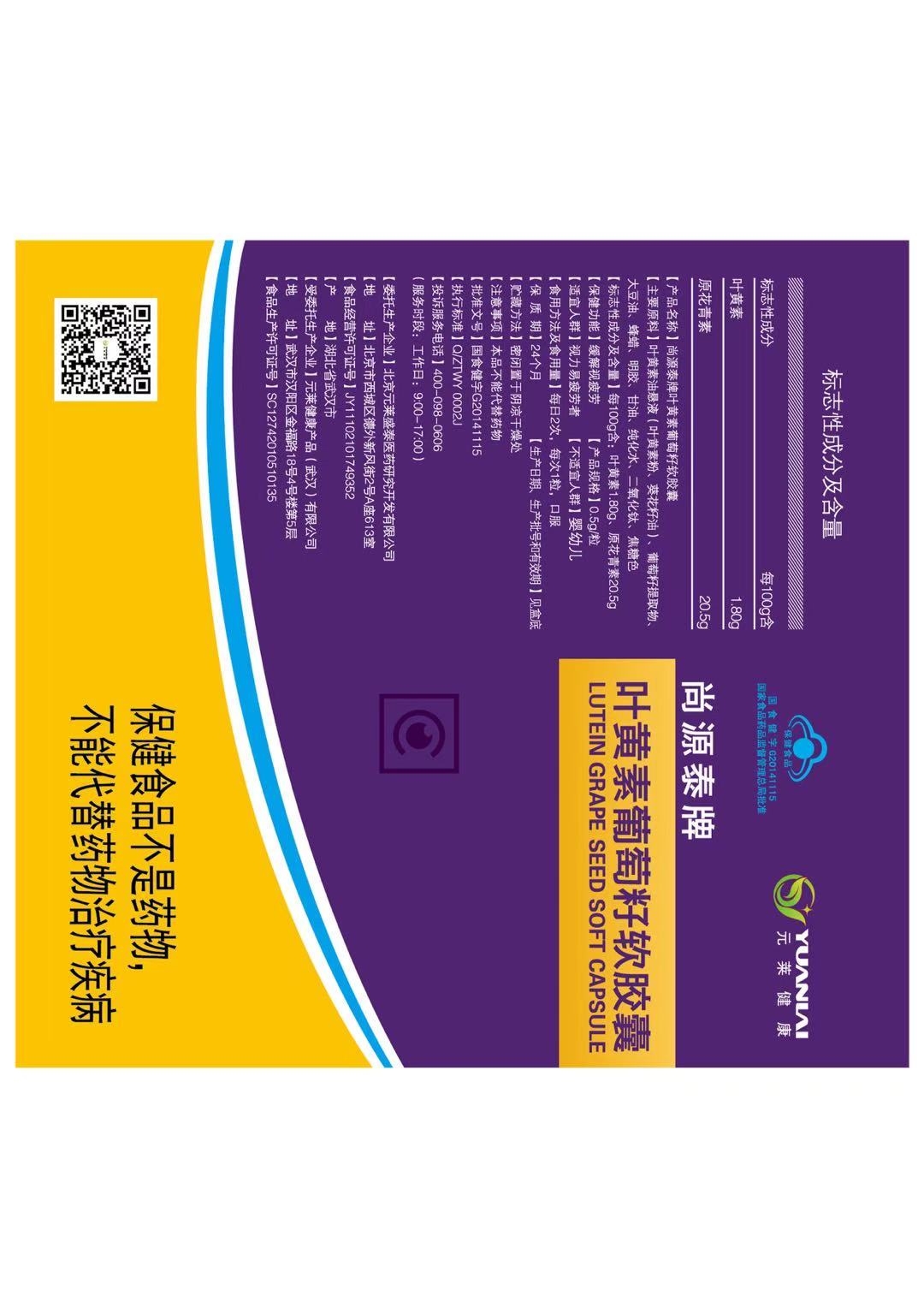 | 鄂食健广审(文)第221221-00463号 | 元莱健康产品(武汉)有限公司 | 尚源泰牌叶黄素葡萄籽软胶囊 | 文 | 2022年12月21日 | 国食健字G20141115 | |