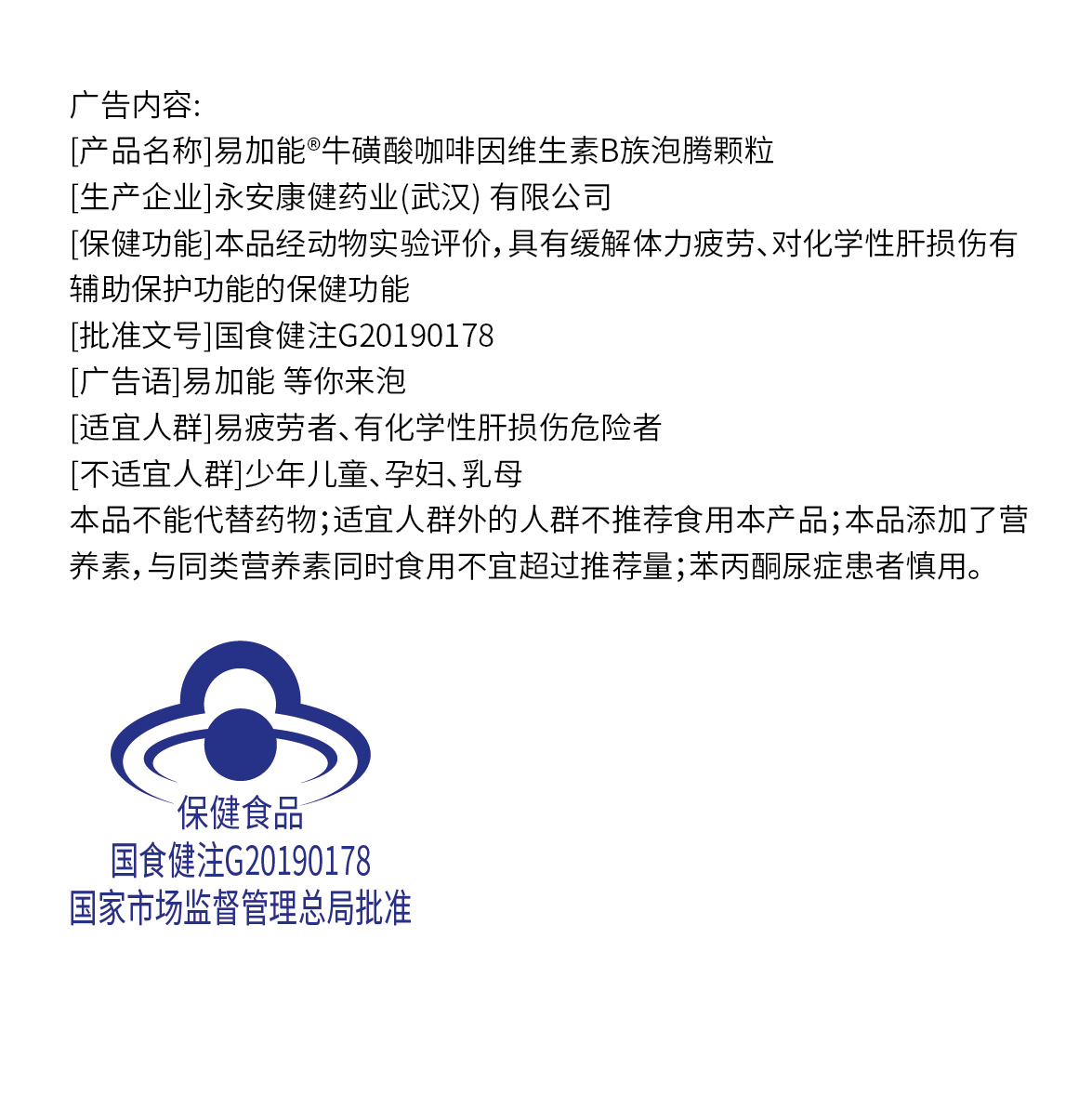| 鄂食健广审(文)第221221-00458号 | 永安康健药业(武汉)有限公司 | 易加能牛磺酸咖啡因维生素B族泡腾颗粒 | 文 | 2022年12月21日 | 国食健注G20190178 | |