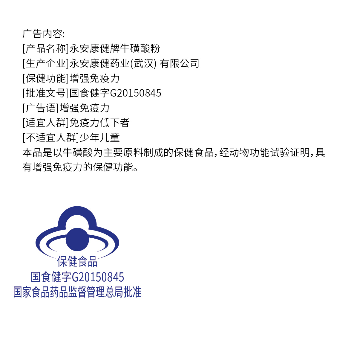| 鄂食健广审(文)第221221-00456号 | 永安康健药业(武汉)有限公司 | 永安康健牌牛磺酸粉 | 文 | 2022年12月21日 | 国食健注G20150845 | |