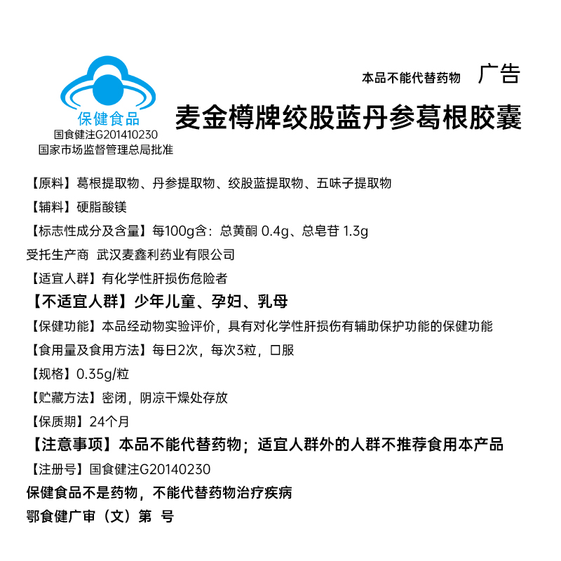 | 国食健注G20140230 | 武汉麦鑫利药业有限公司 | 麦金樽牌绞股蓝丹参葛根胶囊 | 文 | 鄂食健广审(文)第240807-02301号 | 2024年8月7日 | |