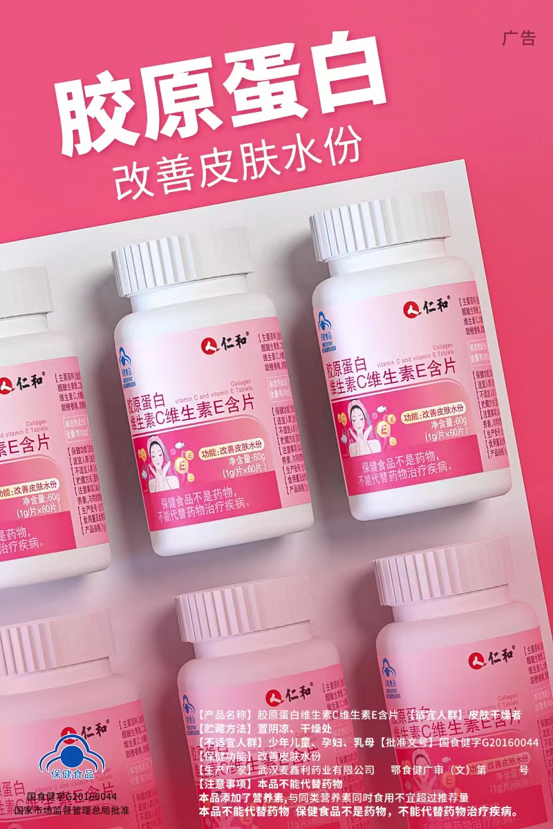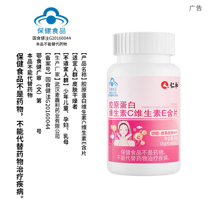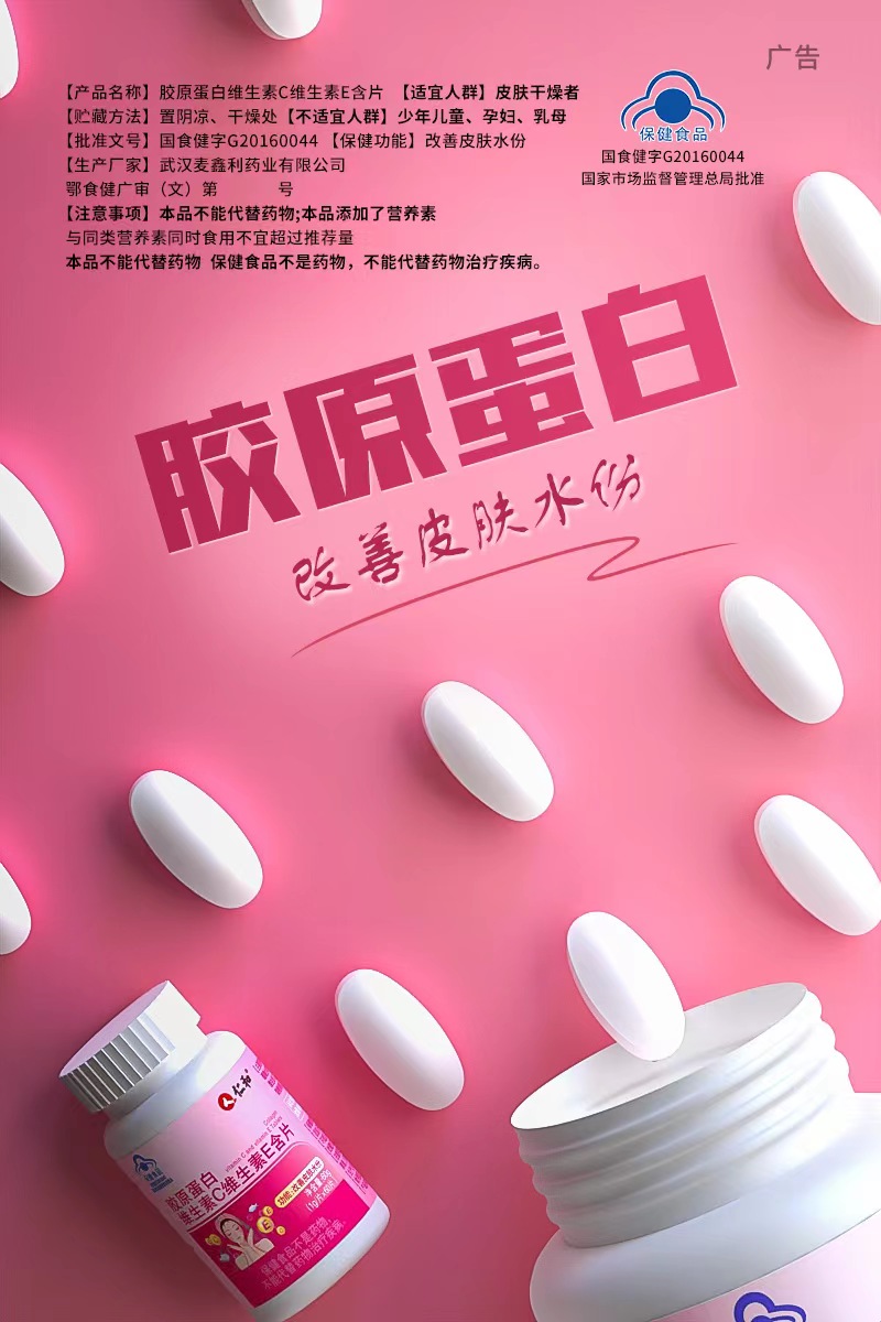 | 国食健字G20160044 | 武汉麦鑫利药业有限公司 | 胶原蛋白维生素C维生素E含片 | 文 | 鄂食健广审(文)第240816-02468号 | 2024年8月16日 | |
