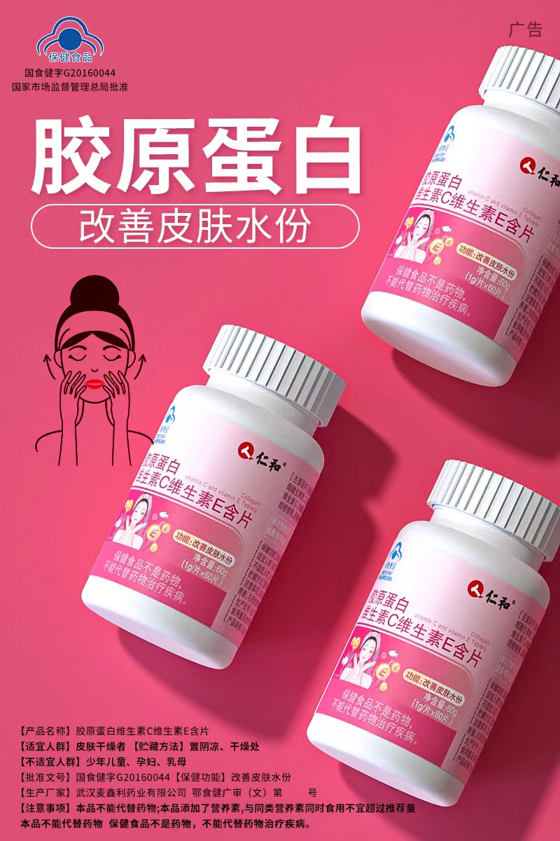 | 国食健字G20160044 | 武汉麦鑫利药业有限公司 | 胶原蛋白维生素C维生素E含片 | 文 | 鄂食健广审(文)第240816-02469号 | 2024年8月16日 | |
