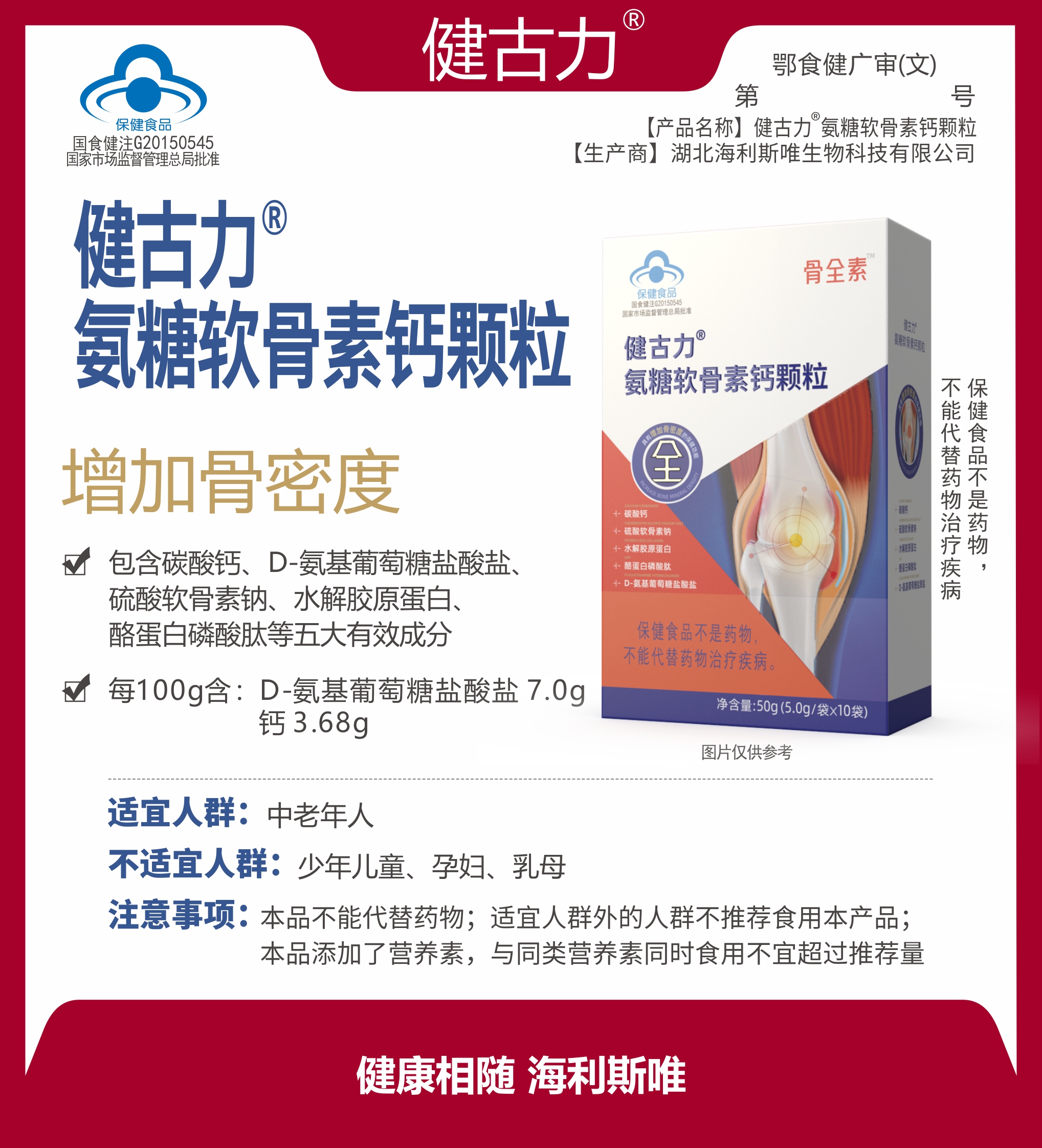 | 国食健注G20150545 | 湖北海利斯唯生物科技有限公司 | 健古力?氨糖软骨素钙颗粒 | 文 | 鄂食健广审(文)第240811-02398号 | 2024年8月11日 | |