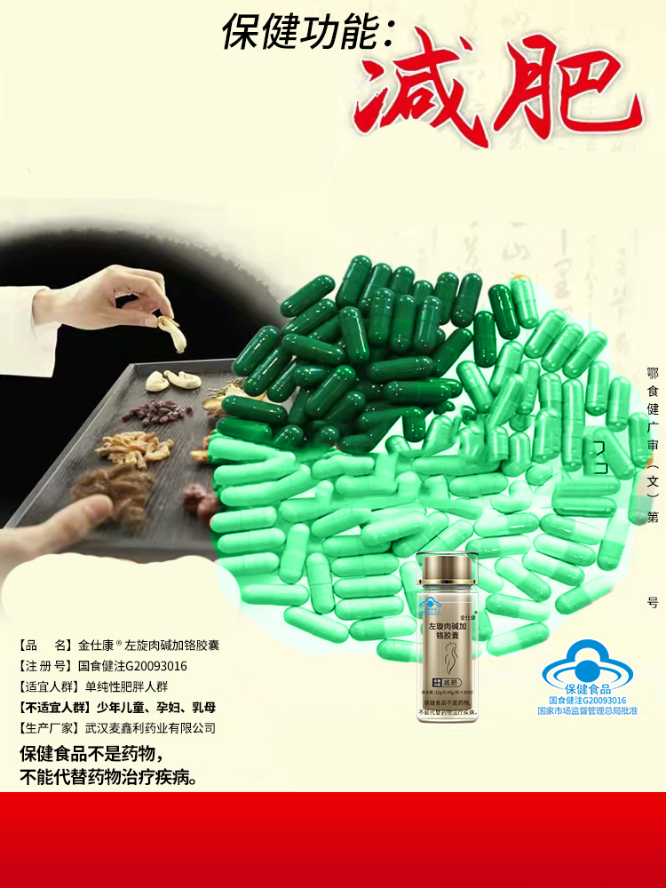 | 国食健注G20090316 | 武汉麦鑫利药业有限公司 | 金仕康?左旋肉碱加铬胶囊 | 文 | 鄂食健广审(文)第240807-02295号 | 2024年8月7日 | |