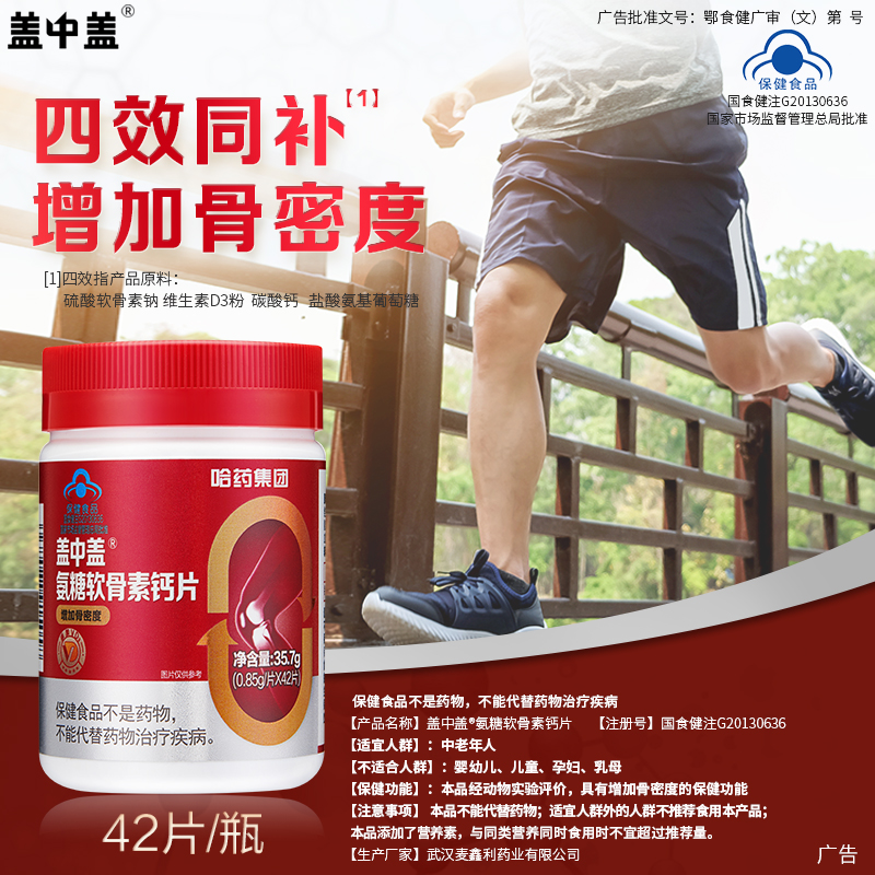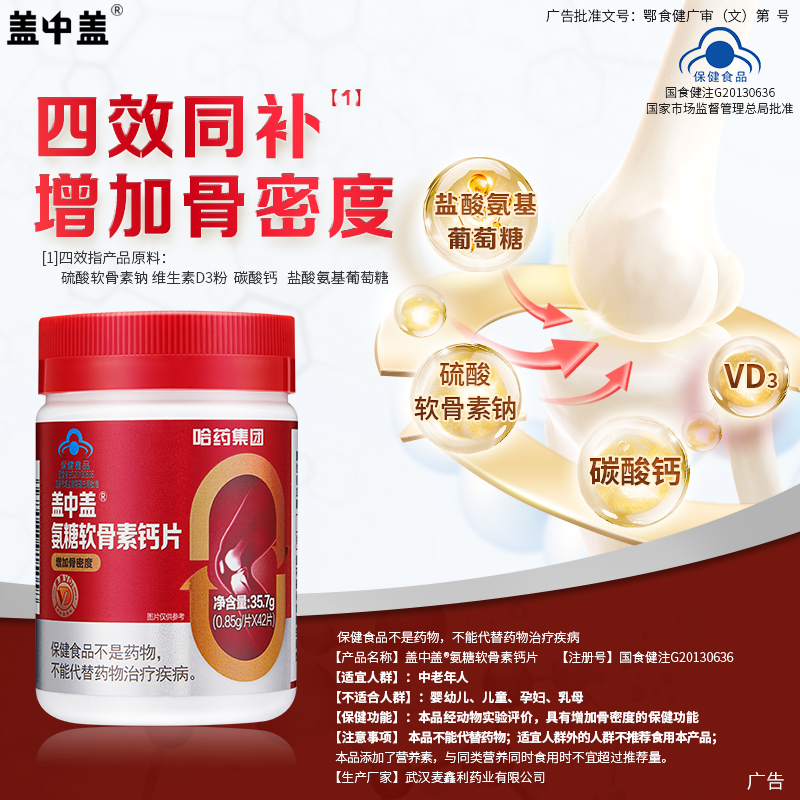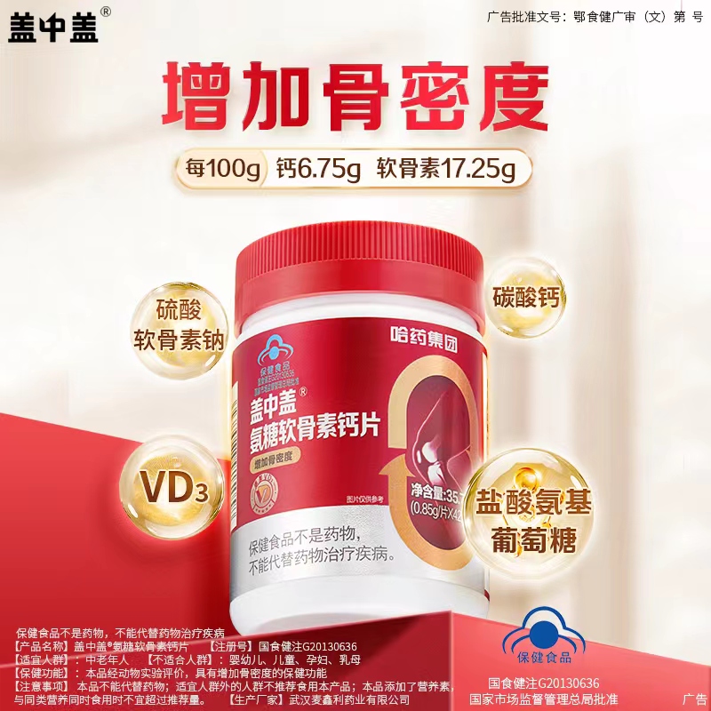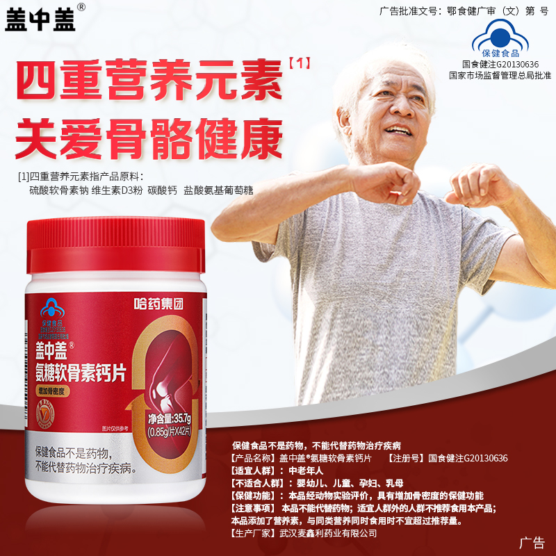 | 国食健注G20130636 | 武汉麦鑫利药业有限公司 | 盖中盖 氨糖软骨素钙片 | 文 | 鄂食健广审(文)第250213-03495号 | 2025年2月13日 | |