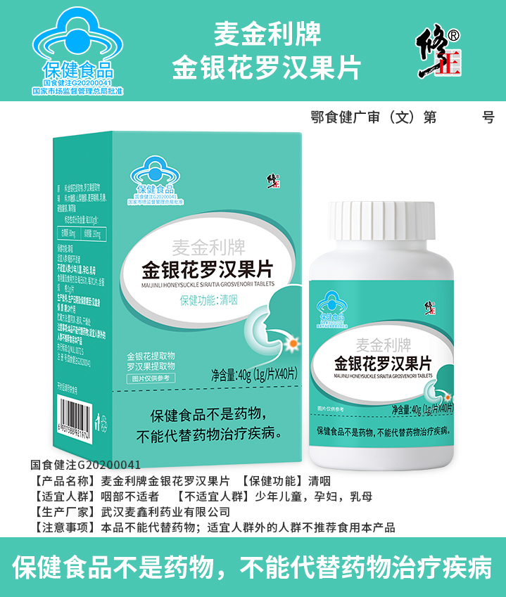 | 国食健注G20200041 | 武汉麦鑫利药业有限公司 | 麦金利牌金银花罗汉果片 | 文 | 鄂食健广审(文)第250213-03486号 | 2025年2月13日 | |